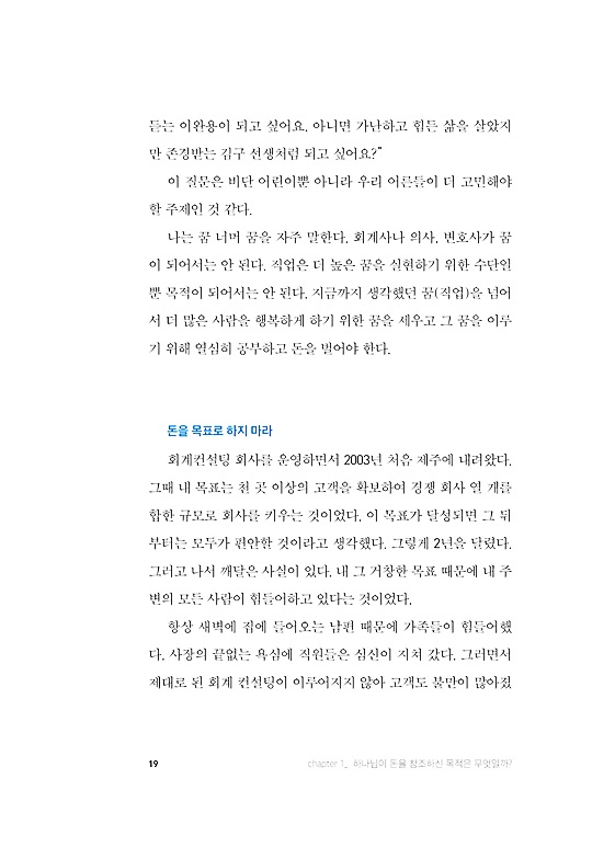 그런데도 왜 우리는 성경을 보면서 돈을 배우지 못할까? 왜 비뚤어진 시각으로 돈을 대하다가 돈 때문에 울고, 돈 때문에 신앙을 놓치는 것일까? 왜 가난에서 벗어나지 못하고 힘들게 사는 것일까? 그것은 성경적인 경제를 배우지 않았기 때문이다. ‘돈’ 하면 미리부터 부정하다 생각하고 배우려 하지 않았기 때문이다.