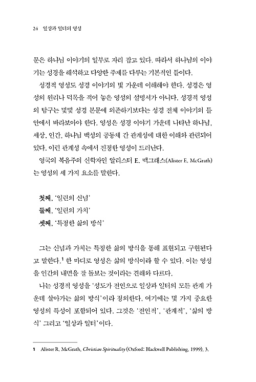 저자는 영성이란 말을 본질에서부터 살아 꿈틀거리는 삶의 이야기로 풀어냈다. 성경에 근거한 탄탄한 이론으로부터 삶의 실천까지, 더 나아가 훈련에 이르기까지 영성의 종합 선물 세트를 손에 쥐여 주는 느낌이다.