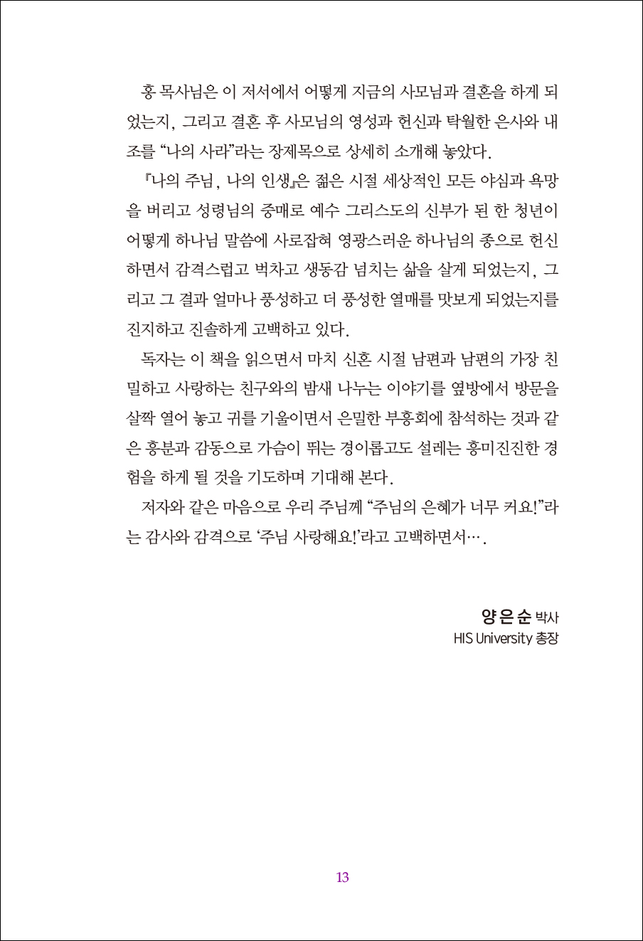 바울 사도의 간증을 인용하여 감히 나에게 적용할 수 있다면 참으로 영광일 것이다. “그러나 내가 나 된 것은 하나님의 은혜로 된 것이니, 내게 주신 그의 은혜가 헛되지 아니하여 내가…많이 수고하였으나, 내가 한 것이 아니요 오직 나와 함께 하신 하나님의 은혜로라” (고전 15:10). 바울 사도처럼 나도 ‘나의 주님My Lord’을 자랑하고 싶어서 이 책을 썼다. ‘나의 주님’으로 인하여 ‘나의 인생My Life’의 방향이 결정되었기 때문이다.