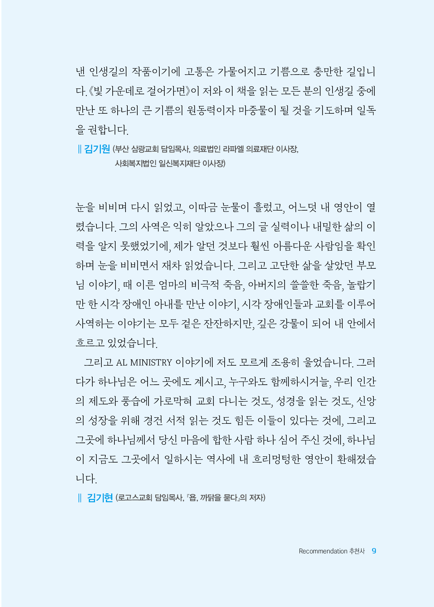 눈을 비비며 다시 읽었고, 이따금 눈물이 흘렀고, 어느덧 내 영안이 열렸습니다. 고단한 삶을 살았던 부모님 이야기, 때 이른 어머니의 비극적 죽음과 아버지의 쓸쓸한 죽음, 시각 장애인 아내를 만난 이야기, 시각 장애인들과 교회를 이루어 사역하는 이야기는 모두 겉은 잔잔하지만, 깊은 강물이 되어 내 안에서 흐르고 있습니다.