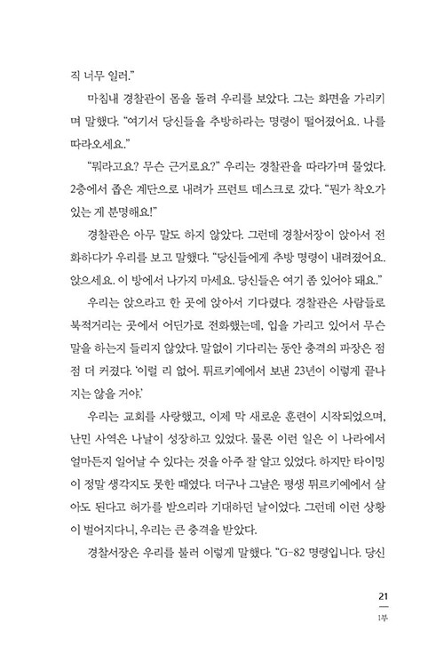 이국 땅에서 커다란 철제문 뒤에 갇혀 열쇠가 돌아가는 소리와 빗장이 질러지는 소리를 처음 들으면 등골이 서늘해진다. 어떻게 해도 안심이 되지 않는다. 이제 무슨 일이든 일어날 수 있다. 그것을 깨닫는 순간, 통제력을 잃고 불확실성 속에 내던져진다.