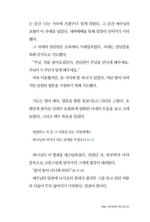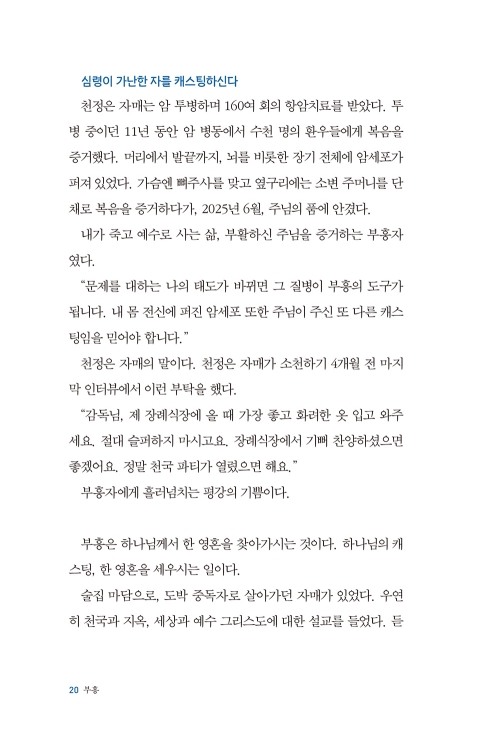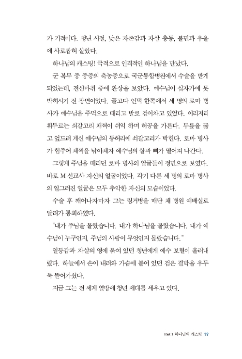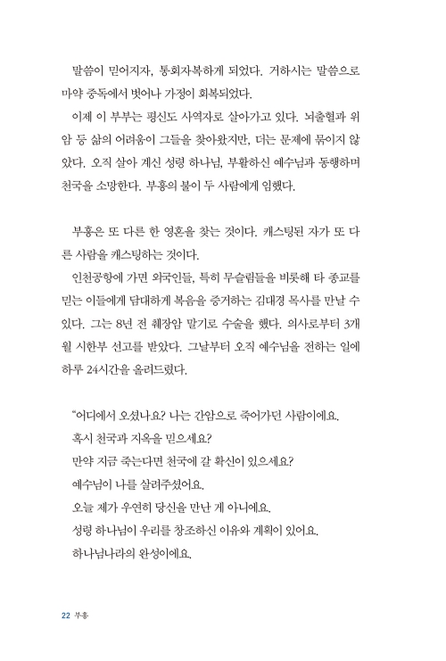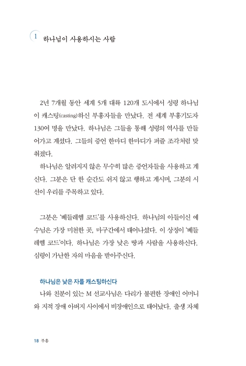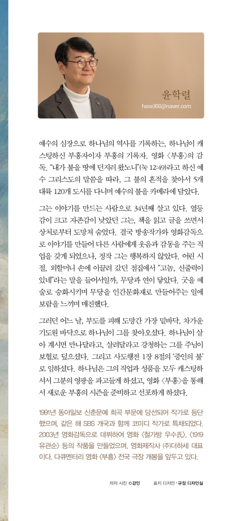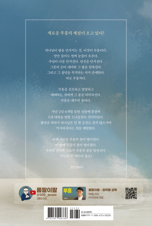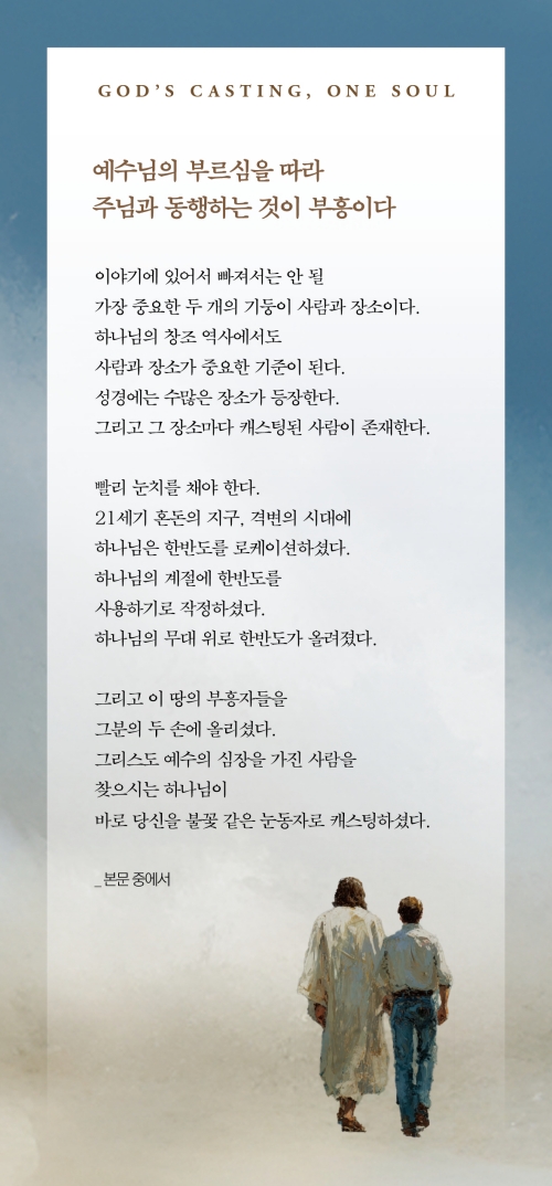 드라마나 영화에서 캐스팅과 로케이션이 중요하듯, 하나님의 역사에서도 사람과 장소가 중요하다. 하나님은 땅을 선택하시고 사람을 캐스팅하셔서 부흥의 불을 던져주신다. 하나님은 방송작가 출신의 영화감독인 저자를 부흥자이자 부흥의 기록자로 캐스팅하셔서 영화〈부흥〉을 찍게 하셨다. 이 책은 5개 대륙 120개 도시를 다니며 130여 명의 부흥 증거자를 만난 2년 7개월간 여정의 기록이다. 부흥은 성령 하나님이 택하신 ‘한 영혼’으로부터 시작된다. 저자는 부흥을 준비하고 기도하는 부흥자로 이 책의 독자 한 명 한 명을 부르셨음을 확신으로 전하고 있다. 영화 <부흥>은 2026년 1월 1일 전국 개봉 예정이다.