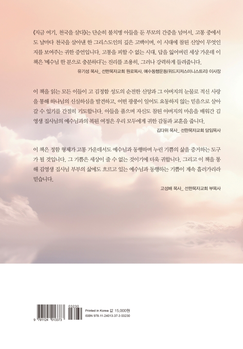 《지금 여기, 천국을 살다》는 단순히 불치병 아들을 둔 부모의 간증을 넘어서, 고통 중에서 도 날마다 천국을 살아낸 한 그리스도인의 깊은 고백이며, 이 시대에 참된 신앙이 무엇인지를 보여 주는 귀한 증언입니다. 고통을 피할 수 없는 시대, 답을 잃어버린 세상 가운데 이 책은 예수님 한 분으로 충분하다'는 진리를 조용히, 그러나 강력하게 들려줍니다.
