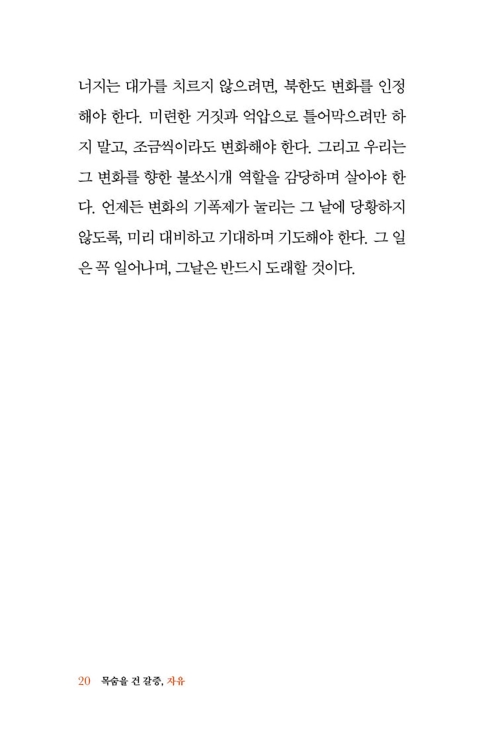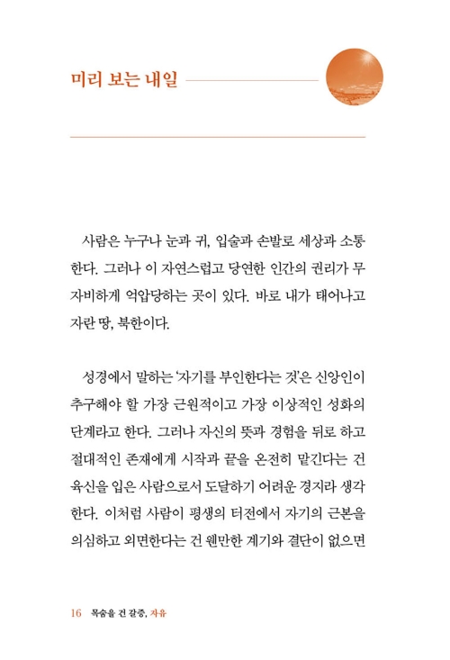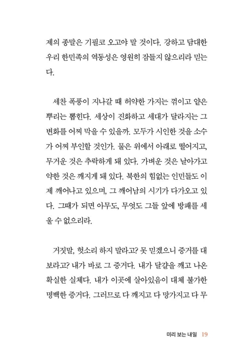 이 책을 통해 북한의 잔혹하고도 비참한 현실이 더 널리 알려지기를 소망한다, 나를 포함한 탈북민들이 대한민국에 드리는 감사 기도가 되길 원한다. 덧붙여 북한 동포들을 위해 우리가 반드시 해야 할 당부를 전하고 싶다. 이 책이 나와 우리를 통해 일하시는 하나님의 인도하심을 경험하고, 우리가 마땅히 해야 할 기도의 사명을 놓지 않는 시간이 되기를 기도한다. 책이 나오기까지 애써 주신 킹덤북스(Kingdom Books) 대표 윤상문 목사님과 모든 직원 분들께 감사드린다.