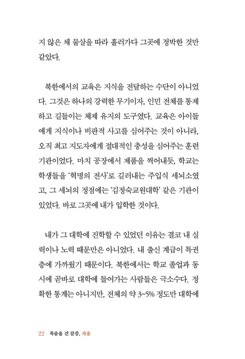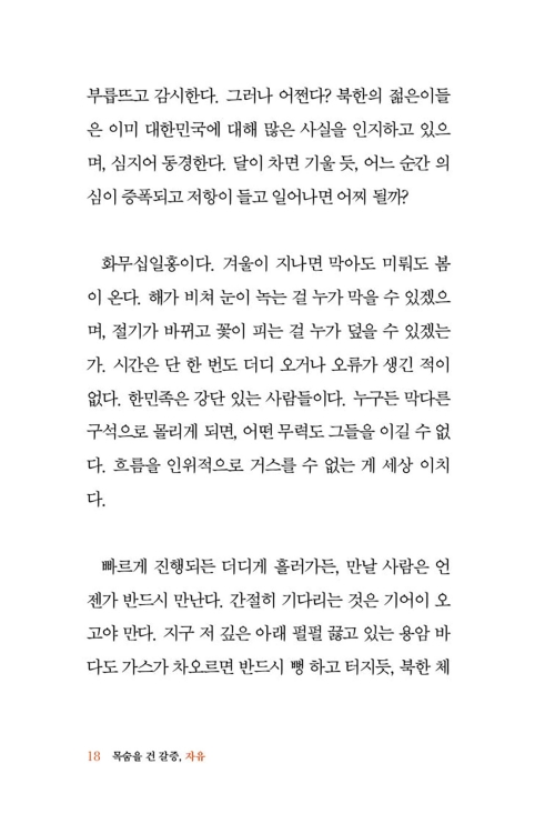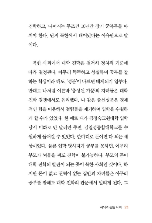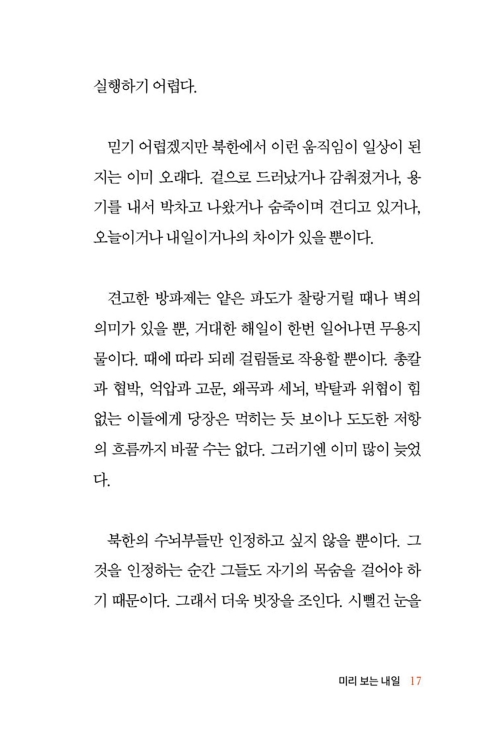 내게 마음 써 주는 오빠의 마음을 알면서 나는 툭툭 한 마디씩 던진다. 그럼 오빠는 요리조리 내 눈을 피하며 시치미를 뗀다. 나를 만나면 기관총으로 쏴 버리겠다고 분노하던 오빠가 해외 유학을 가고 외국계 기업에서 일하며 잘 살아가는 걸 보면, 아직도 꿈을 꾸는 건가 싶다. 북한 특수부대 참모장 출신 아버지와 김정일 친위부대 출신 오빠 그리고 어머니와 나, 이렇게 우리 4식구는 조선 민주주의 인민 공화국을 떠나 대한민국으로 국적을 바꿨다.