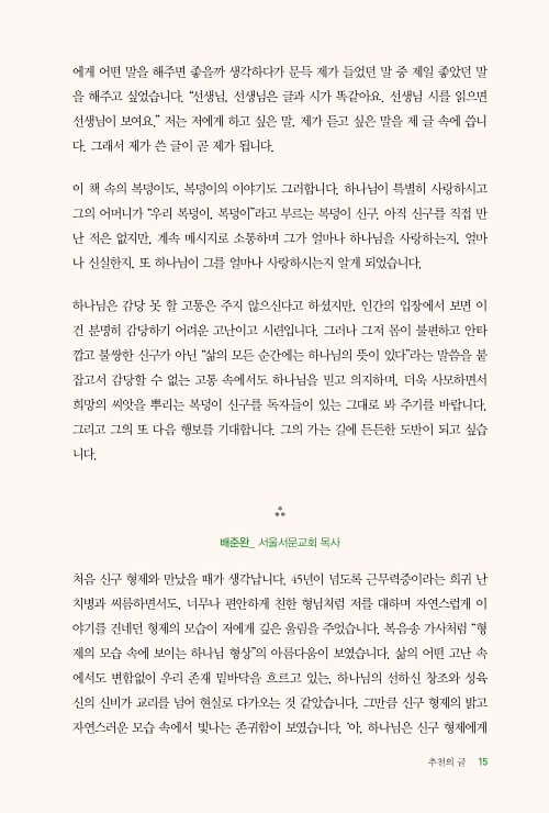 이 책 속의 복덩이도, 복덩이의 이야기도 그러합니다. 하나님이 특별히 사랑하시고 그의 어머니가 “우리 복덩이, 복덩이”라고 부르는 복덩이 신구. 아직 신구를 직접 만난 적은 없지만, 계속 메시지로 소통하며 그가 얼마나 하나님을 사랑하는지, 얼마나 신실한지, 또 하나님이 그를 얼마나 사랑하시는지 알게 되었습니다.