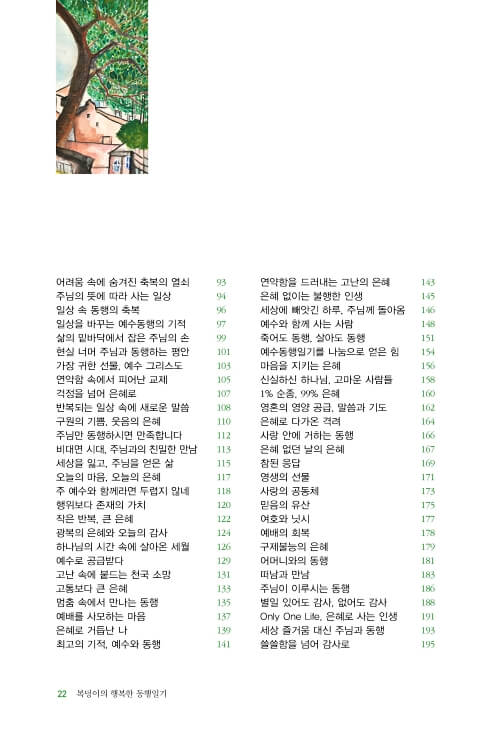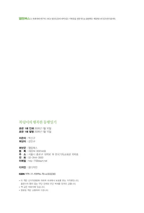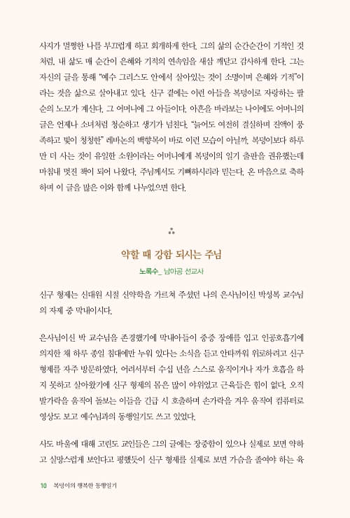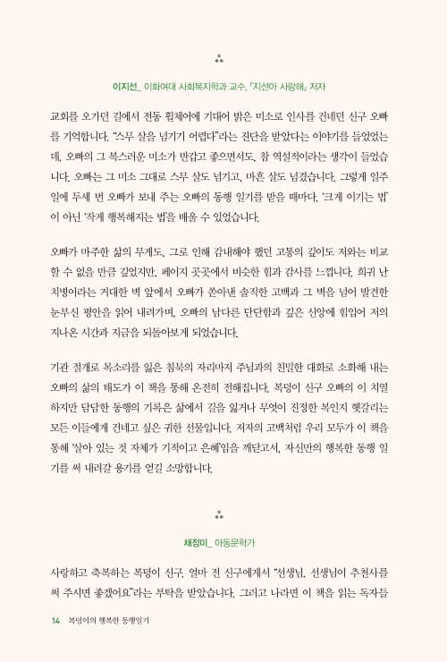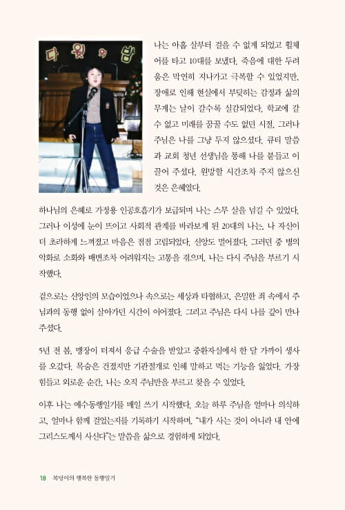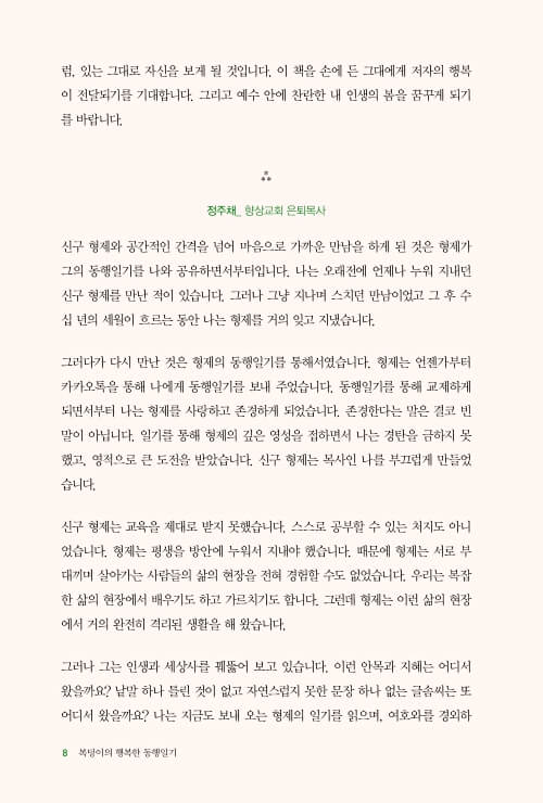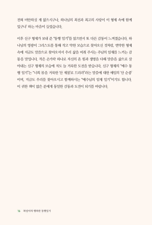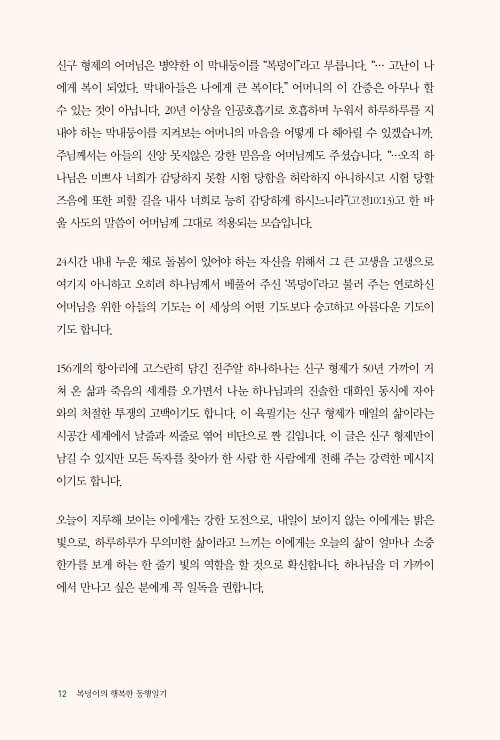 기관 절개로 목소리를 잃은 침묵의 자리마저 주님과의 친밀한 대화로 소화해 내는 오빠의 삶의 태도가 이 책을 통해 온전히 전해집니다. 복덩이 신구 오빠의 이 치열하지만 담담한 동행의 기록은 삶에서 길을 잃거나 무엇이 진정한 복인지 헷갈리는 모든 이들에게 건네고 싶은 귀한 선물입니다. 저자의 고백처럼 우리 모두가 이 책을 통해 ‘살아 있는 것 자체가 기적이고 은혜’임을 깨닫고서, 자신만의 행복한 동행 일기를 써 내려갈 용기를 얻길 소망합니다.