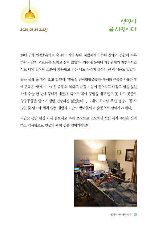 20대가 되기 전에 끝난다는 절망적인 의사의 말이 있었지만, 20세가 두 번 지나고 8년을 더 살고 있습니다. 꼼짝 없이 누워 있으면서도 환하게 빛나는 그의 얼굴을 봅니다. 누구의 도움 없이는 아무것도 할 수 없으면서, 움직일 수 있는 손가락으로 글을 쓴다는 사실이 놀랍습니다.