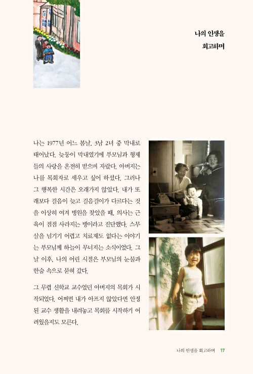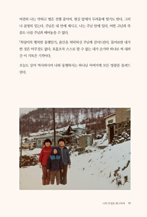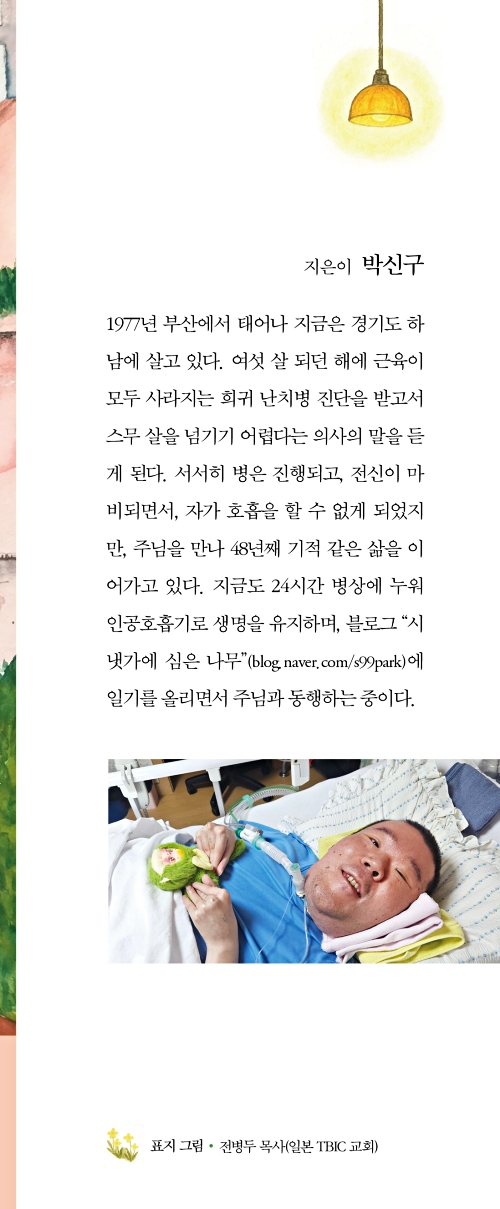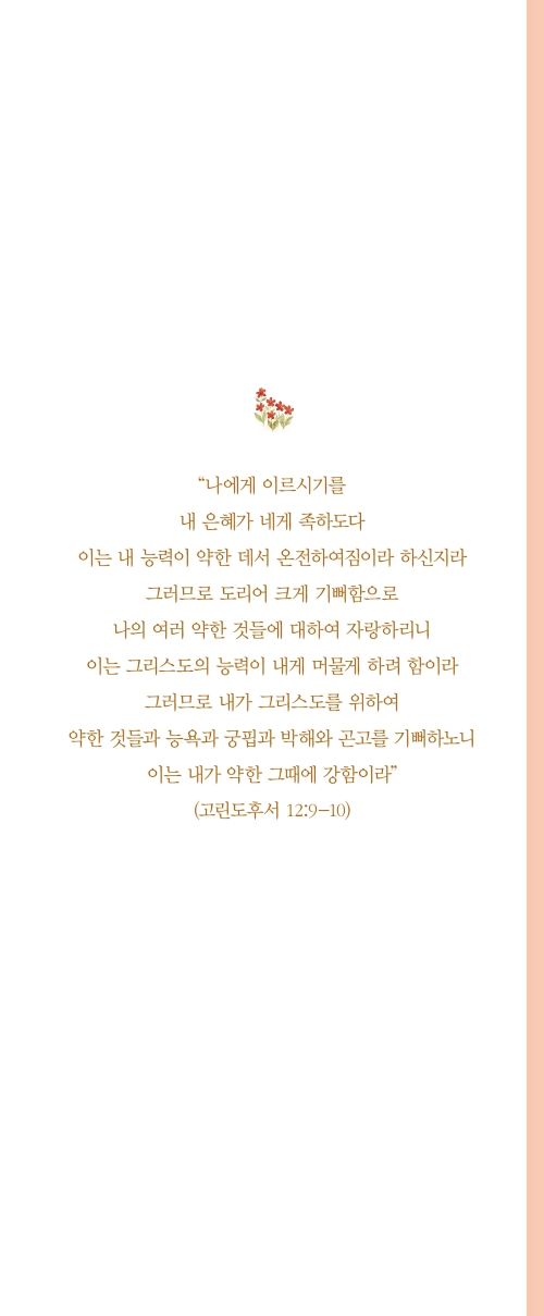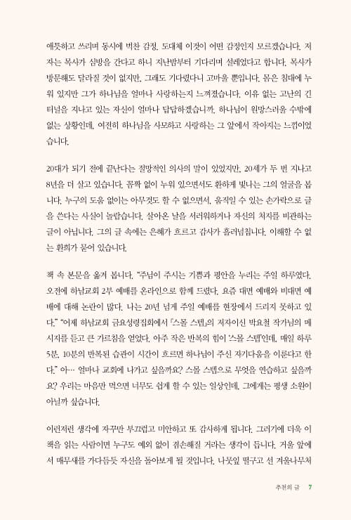 오빠가 마주한 삶의 무게도, 그로 인해 감내해야 했던 고통의 깊이도 저와는 비교할 수 없을 만큼 깊었지만, 페이지 곳곳에서 비슷한 힘과 감사를 느낍니다. 희귀 난치병이라는 거대한 벽 앞에서 오빠가 쏟아낸 솔직한 고백과 그 벽을 넘어 발견한 눈부신 평안을 읽어 내려가며, 오빠의 남다른 단단함과 깊은 신앙에 힘입어 저의 지나온 시간과 지금을 되돌아보게 되었습니다.