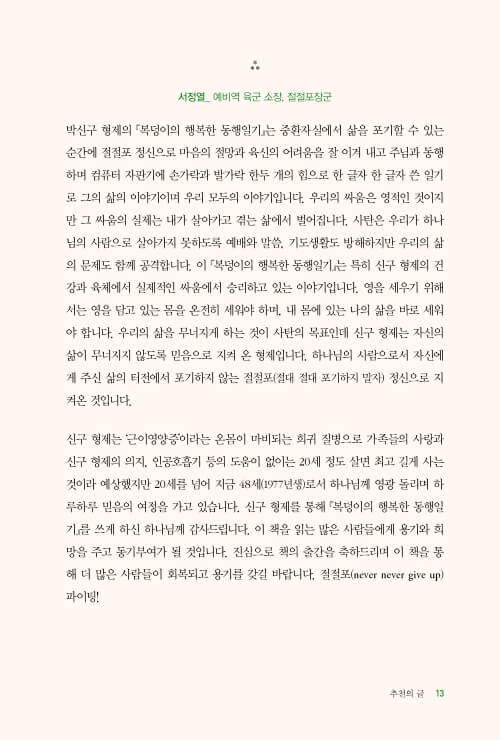 신구 형제는 ‘근이영양증’이라는 온몸이 마비되는 희귀 질병으로 가족들의 사랑과 신구 형제의 의지, 인공호흡기 등의 도움이 없이는 20세 정도 살면 최고 길게 사는 것이라 예상했지만 20세를 넘어 지금 48세(1977년생)로서 하나님께 영광 돌리며 하루하루 믿음의 여정을 가고 있습니다. 신구 형제를 통해 『복덩이의 행복한 동행일기』를 쓰게 하신 하나님께 감사드립니다. 이 책을 읽는 많은 사람들에게 용기와 희망을 주고 동기부여가 될 것입니다. 진심으로 책의 출간을 축하드리며 이 책을 통해 더 많은 사람들이 회복되고 용기를 갖길 바랍니다. 절절포(never never give up) 파이팅!
