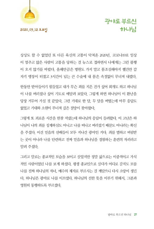 책 속 본문을 옮겨 봅니다. “주님이 주시는 기쁨과 평안을 누리는 주일 하루였다. 오전에 하남교회 2부 예배를 온라인으로 함께 드렸다. 요즘 대면 예배와 비대면 예배에 대해 논란이 많다. 나는 20년 넘게 주일 예배를 현장에서 드리지 못하고 있다