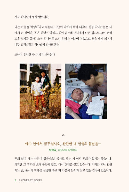 저자의 이 치열하지만 담담한 동행의 기록은 삶에서 길을 잃거나 무엇이 진정한 복인지 헷갈리는 모든 이들에게 건네고 싶은 귀한 선물입니다.
