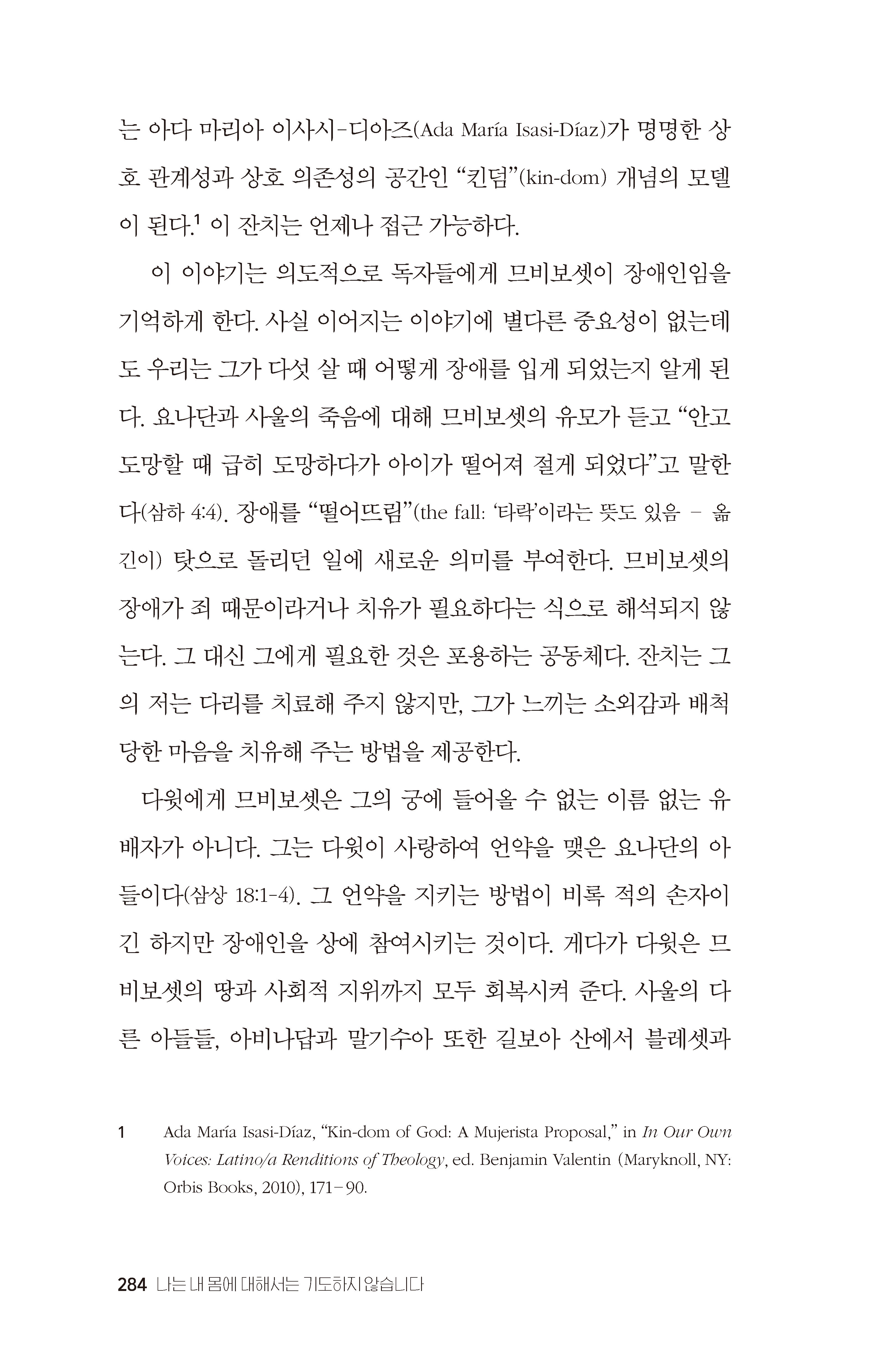 성경 전반에 걸쳐 우리는 하나님이 인류와 함께하시기로 선택하신 일 그 최전선에 서 있는 장애인들을 만날 수 있다. 이삭은 눈이 멀었고, 야곱은 다리를 절었다. 레아는 시력이 약했고(창 29:17), 모세는 언어 장애가 있었다. 엘리야는 우울에 빠져 자살 충동을 느꼈다. 디모데는 위장에 문제가 있었고 “자주 나는 병”이 있었다(딤전 5:23). 바울에게는 육체의 가시가 있었다(고후 12:7). 그리고 므비보셋은 두 다리를 모두 절었다! 선한 목자이신 주님은 우리의 몸이 “정상”이거나 완치된 것과는 상관없이 풍성한 삶을 주신다. 하나님이 주시는 치유는 우리 몸의 상태에 따라 달라지지 않는다. 그리고 요한복음 9장에 따르면 이웃 사람들에게 하나님을 나타낸 것은 스가랴가 맹인이었을 때였지 기적적으로 눈을 떴을 때가 아니었다. 아마도 우리가 장애를 살아 계신 하나님을 나타내는 도구로 받아들이기 시작한다면, 기도하는 가해자들이 교회에서 나에게 다가와 마술사 신학을 들이대는 일은 없어질 것이다. _ <1. 장애 치료> 중에서