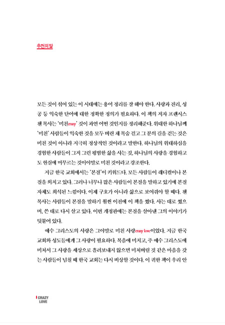 프랜시스 챈만의 독특한 스타일과 편안한 잠에 빠져든 교회를 깨우려는 절박감이 잘 조합된 《크레이지 러브》는 순식간에 우리의 마