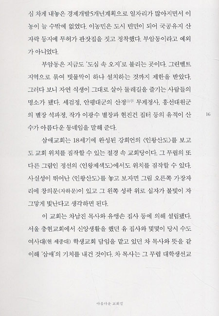 소개한다. 서울 한복판에 자리하지만 전원교회 같은 부암동 삼애교회나 추풍령 고갯길에 그림같이 지어진 단해교회 등을 찾아가는 길