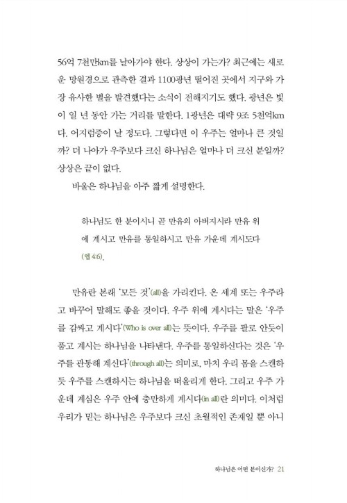 마치 영성이 깊은 한 신학자와 일대일 성경공부를 하는 것 같은 느낌이 든다. 일독으로 끝낼 것이 아니라 성경의 참고서로서 늘 옆에 두고 싶은 귀한 책이다.