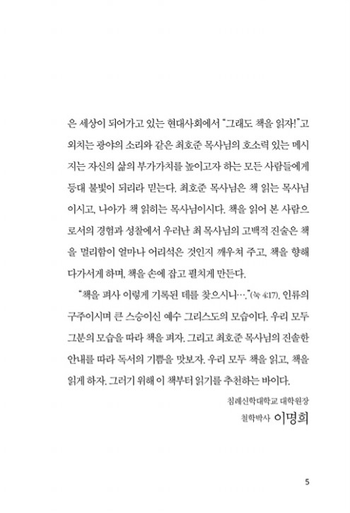 저자는 일반 독자층보단 목회자들을 위해 본 책을 썼다. 목회자들이 여러 목회 사역으로 바쁠지라도 독서를 중단해서는 안 되는 이유, 그리고 어떻게 효과적으로 독서를 지속할 수 있는지를 편안한 문체로 풀어썼다. 독서가 주는 가장 큰 유익은 끊임없이 배우게 되는 겸손일 것이다. 처음엔 사람이 책을 읽지만 나중엔 책이 사람을 읽게 된다는 말은 독서에 있어서 고전이 된 명구다. 독서 습관화를 통해 인격자가 되고 싶다면 먼저 본서를 읽기를 바란다.
