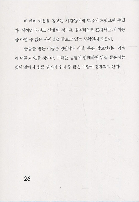 누군가를 돌보는 일은 신체적, 정서적, 영적으로 엄청난 도전이자 선물이다. 친밀한 도움이 필요한 사람들을 상대로 직접 ‘불 시험’을 경험한 헨리 나우웬은 이 책에서 ‘돌봄’의 양면성을 진솔하고 깊이 있게 파헤친다. 그는 이 책에서 자신이 누군가를 돌보는 과정에서 차가운 분노, 뒤섞인 감정, 죄책감 등이 쌓였던 경험을 솔직하게 고백한다. 그리고 인정과 지지와 위안을 얻고 싶었던 내면의 절규, 자신의 부족함과 한계를 뼈저리게 맛본 순간들도 가감 없이 보여 준다. 이렇듯 ‘돌보는 일’의 모든 어려움을 투명하게 밝히면서도 저자는 독자들이 용기를 내서 다시 마음을 열고 지극히 인간다운 열망을 되찾기를 바라는 마음에서 이 책을 썼다. 돌봄을 주고받을 때 비로소 우리가 가장 인간다워지기 때문이다. 돌봄이 ‘돌보는 사람’과 ‘돌봄을 받는 사람’ 양쪽 다 사랑 안에서 자라가는 소명이며, 양쪽 다 내적 치유와 해방과 변화를 경험하는 기회임을 헨리 나우웬은 체험으로 알았다.