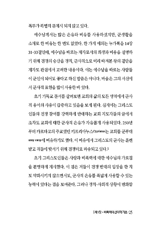 이 책은 초기 기독교 지도자들과 교회 공동체가 전쟁과 평화에 대해 어떻게 이해하고 가르쳤는가를 보여주고 있다. 동시에 초기 기독교가 가르쳐 온 평화사상이 4세기 이후 어떻게 변질되었는가에 대해 소중한 가르침을 주고 있다. 서구에서의 평화사상, 혹은 평화운동은 근원적으로 기독교적 배경에서 기원하였다는 점을 고려해 볼 때 초기 기독교회의 가르침은 오늘 우리에게 귀중한 가르침을 줄 것이다.