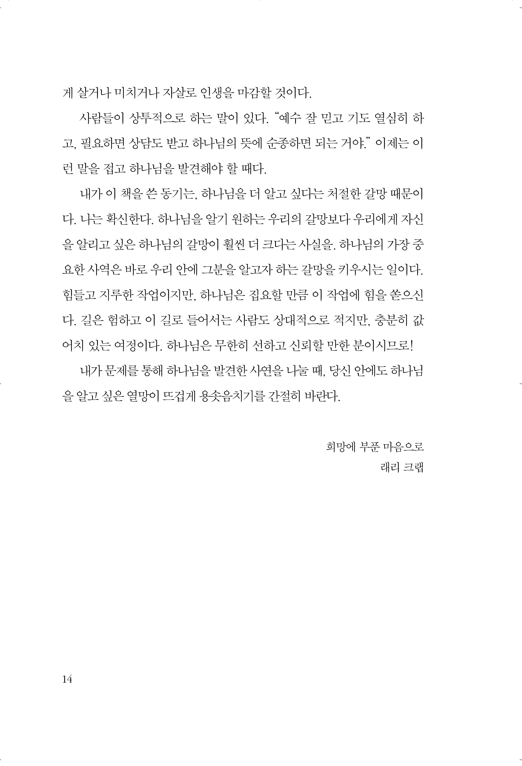 <결혼건축가>, <영적 가면을 벗어라>, <래리 크랩의 파파기도> 등의 저서를 통해 잘 알려진 그리스도인 심리학자 래리 크랩의 초기 대표작이다. 불의의 사고로 형을 잃으면서 맞게 된 저자의 절망과 영적 고투, 그리고 성장의 이야기가 이 책에 생생하게 담겨 있다. 개인적 고통에서 시작된 저자의 솔직한 고백과 그 속에서 하나님을 찾으려는 처절한 갈망과 분투는, “왜 내게 이런 일이 일어나는가?” 하고 외치는 이들, 풀리지 않는 인생 문제로 갈 길을 잃은 이들에게, 지우고 싶은 인생의 순간 속에서도 그분을 발견하는 한 줄기 빛을 비춰 준다. 출간 이후 “내 인생이 변화되었다”, “하나님을 전혀 새롭게 만나게 되었다”는 독자들의 반응을 얻어 온 본서에, 좀 더 깊은 묵상과 그룹 나눔을 위한 스터디 가이드를 추가로 담았다.
