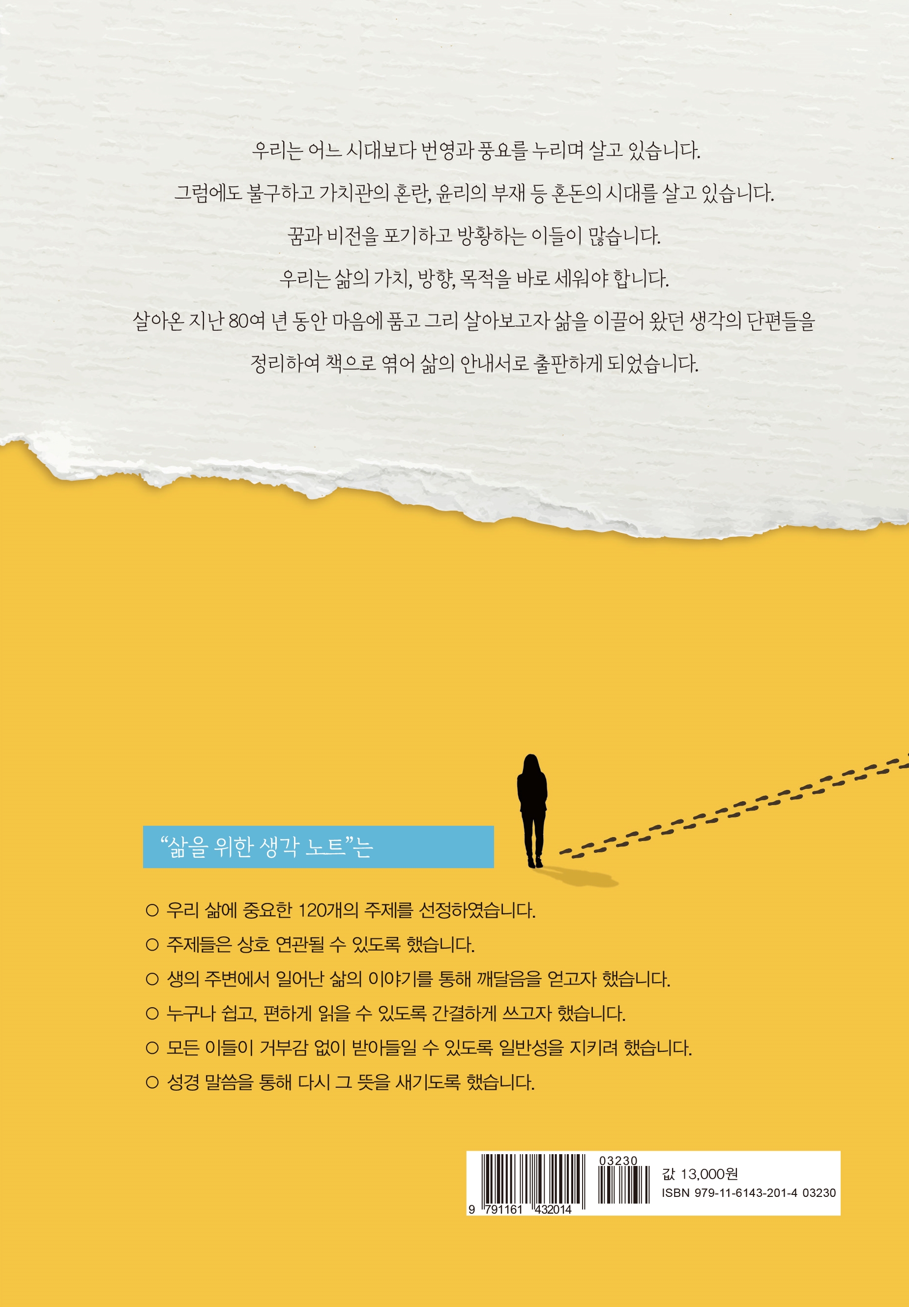 어느 시대보다 번영과 풍요를 누리며 살고 있지만 가치관의 혼란, 윤리의 부재 등 혼돈의 시대를 사는 현대 그리스도인들에게 지난 80여 년 동안 저자가 마음에 품고 삶을 이끌어 왔던 생각의 단편들을 정리하여 삶의 안내서로 출판하였다. 삶에 중요한 9개의 대주제와 120개의 소주제를 선정하여 상호 연관될 수 있도록 편집하여, 간결한 구성으로 쉽게 읽고 이해하도록 했다. 각 주제에 맞는 성경 말씀으로 그 뜻을 다시 한번 마음에 새기도록 각 주제를 마무리한다.