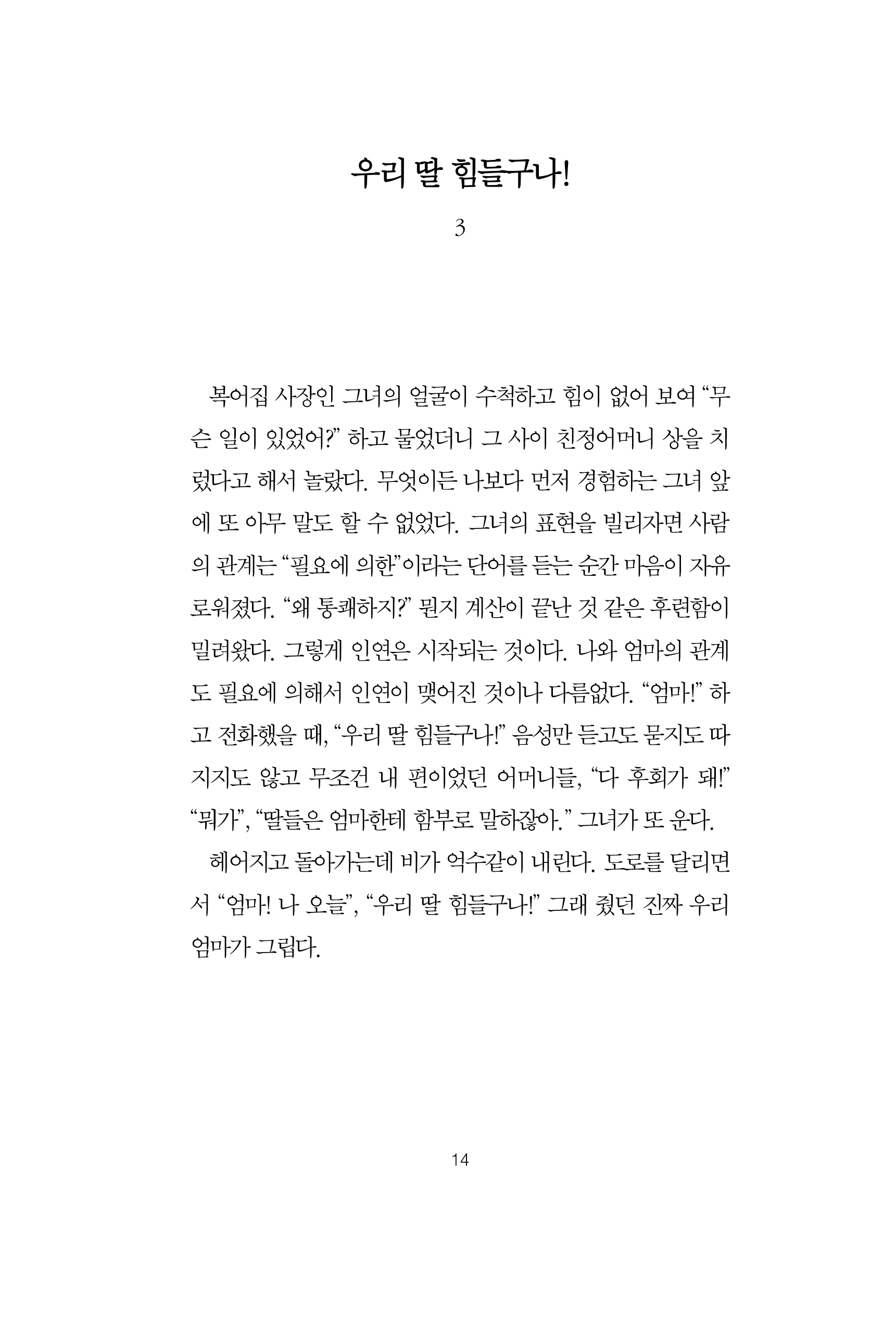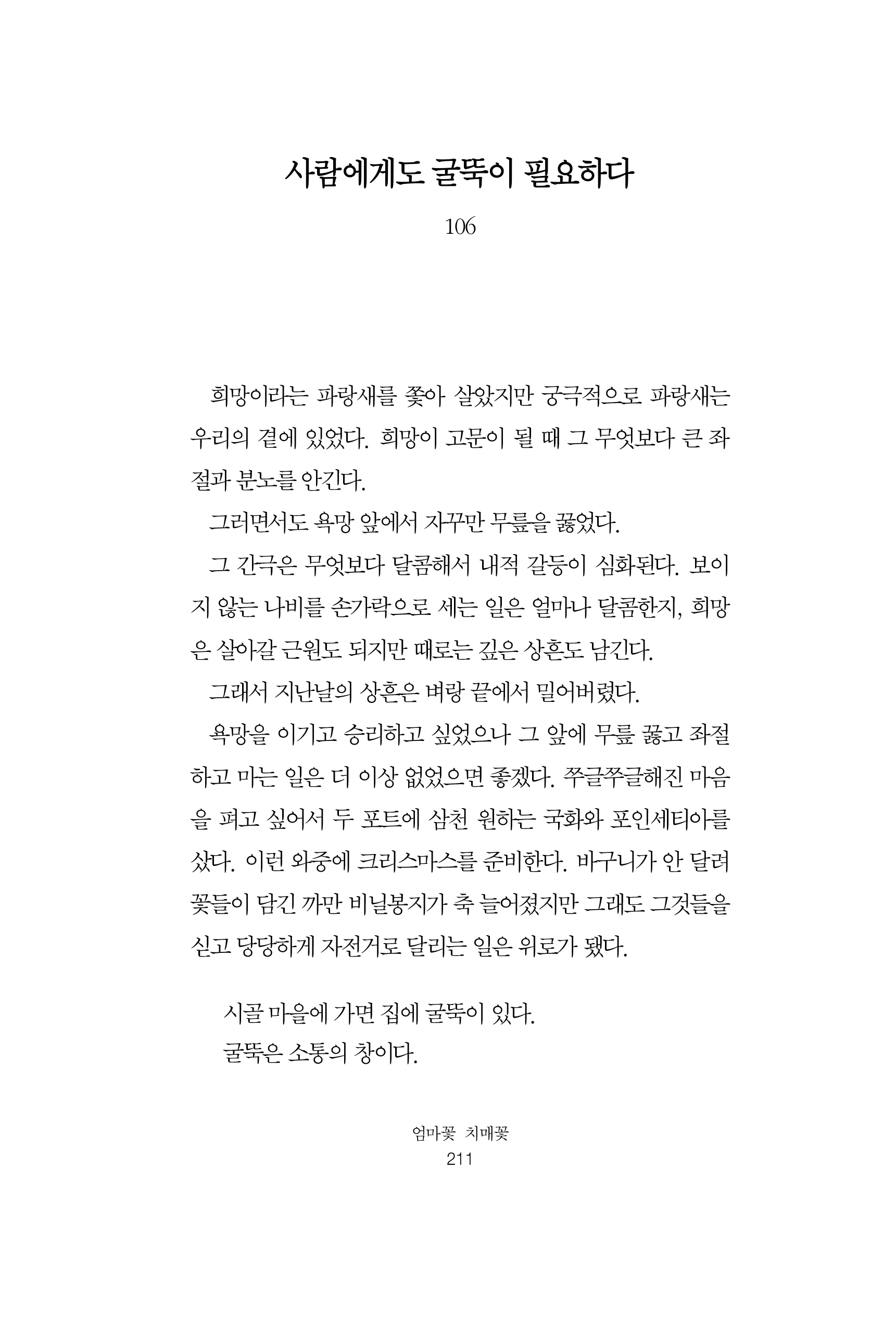 내가 어릴 적에는 엄마 손에 이끌리어 유(功) 치원에 다녔고, 지금은 엄마가 내 손을 잡고 노(老) 치원을 다니신다. 이런 엄마와 동고동락한 지가 벌써 13년째를 맞이한다. 이렇게 엄마의 곁에서 함께 세월을 보내며 일어났던 일들을 알알이 엮어 〈엄마꽃 치매꽃〉이라는 한 권의 책을 엄마에게 바친다. 그리고 이 시대에 울 엄마와 같은 처지에서 살아가는 모든 엄마와 딸 아들들에게 함께 하는 마음을 담아 헌정한다.