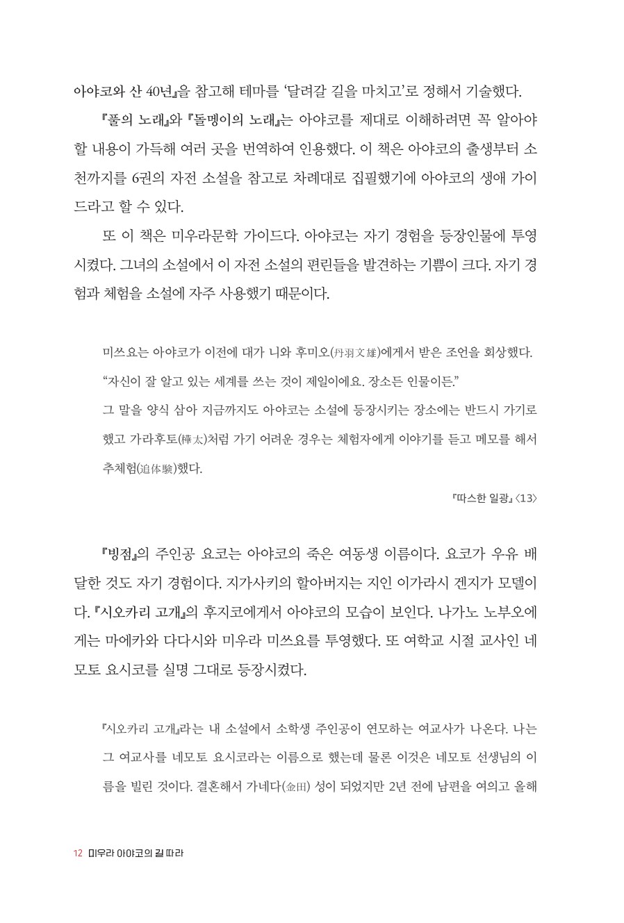 ‘가이드북’처럼 휴대의 편리성을 고려한 듯 부피가 두터운 편은 아니지만, 미우라 아야코를 소개하고자 하는 열의와 정성이 응집된 저자의 아이디어와 필력이 돋보이는 매우 귀중한 저서이다. 이 책을 손에 드는 모든 독자에게, “미우라 아야코의 ‘인생길’을 따라걷다가 그녀의 삶에서 ‘참길’을 만나고, 그의 ‘문학길’을 따라 걷다가 그의 메시지를 발견하고, 그의 ‘여행길’을 따라 걷다가 (독자의) ‘인생길’에 도움을 얻게 되기를 바란다”는 저자의 진심 어린 바람이 자신의 것으로 체험되는 축복이 있기를 함께 기원하게 된다.