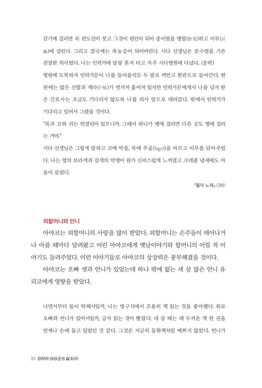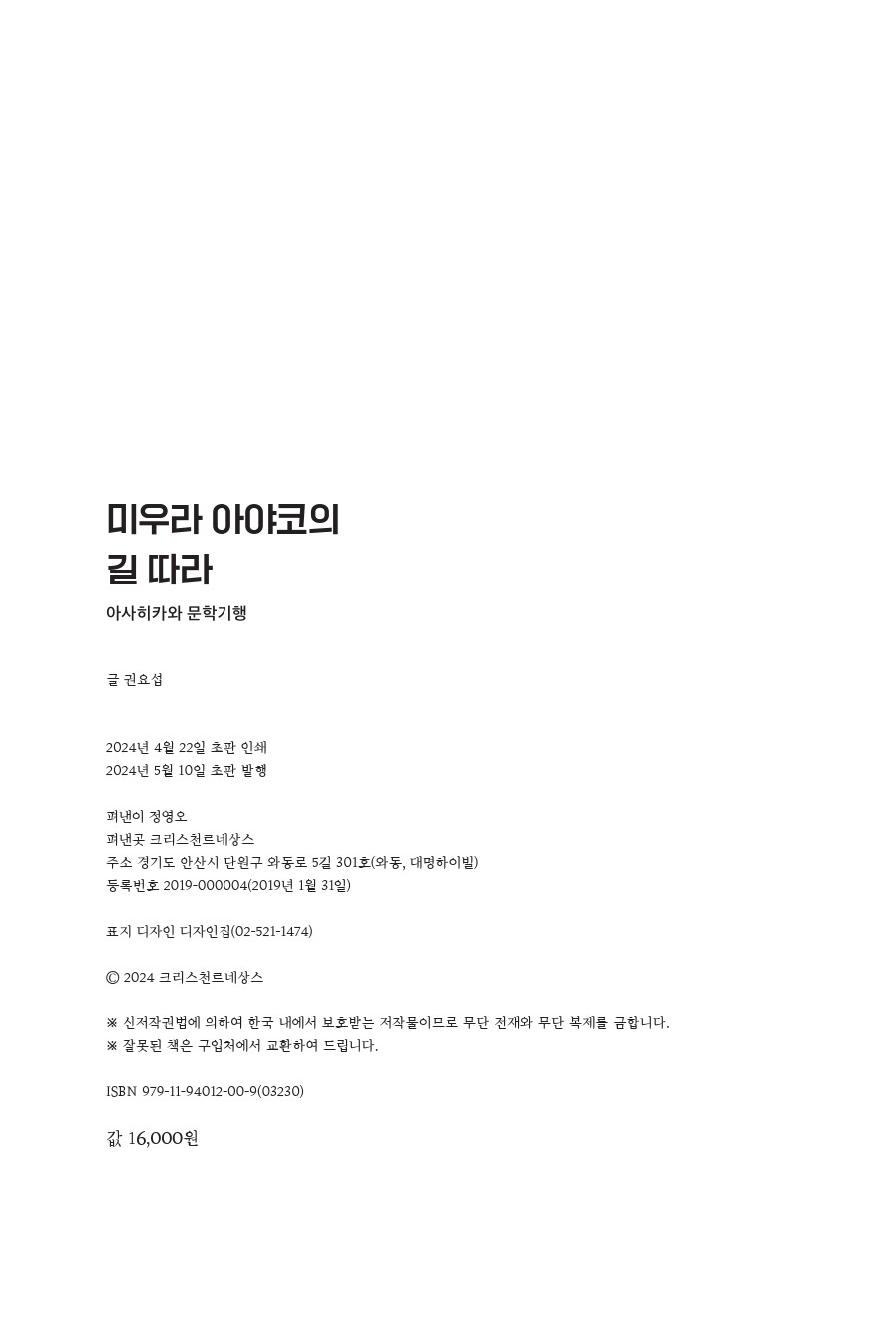 언제나 아야코의 문장을 대할 때면, 부드러운 종이에 손을 베이듯 페이지를 넘기는 그 순간순간 손끝이 아려오는 통증이 저릿하게 스며든다. 나는 이 책에서 아야코의 공간을마주할 때 특유한 채취를 다채롭게 경험했다. 적어도 글로 만난 ‘아사히카와’는 내게 그러했다.