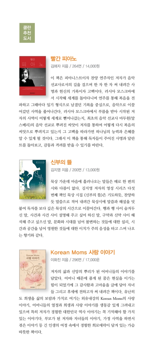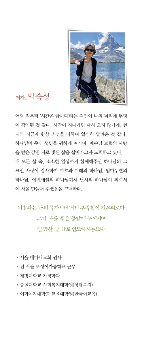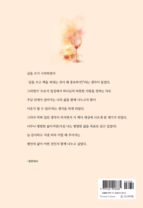 이 책은 저자가 고등학생 때부터 지금까지 써 온 일기를 정리해 삶의 단편을 고스란히 담아낸 에세이집으로, 어린 시절과 가족의 이야기, 자녀를 양육하는 일과 그 이후의 삶까지 한 사람의 평범한 인생 속에 임하시는 주님의 평안을 나누고 있다. 삶의 단편과 묵상, 은혜의 체험이 충만한 이 책을 통해 독자들 또한 일상의 삶을 인도하는 하나님의 사랑을 느낄 수 있으리라 확신한다.