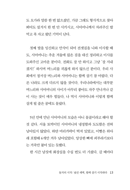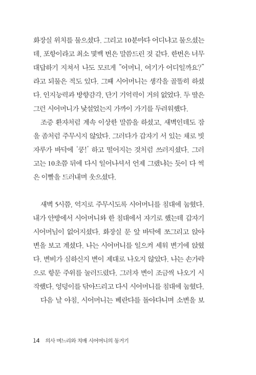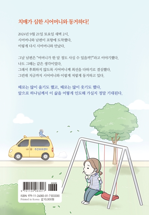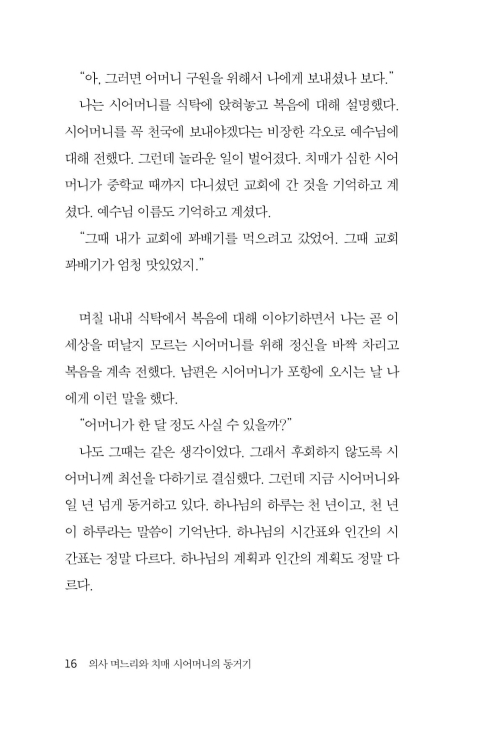 이 책은 저자가 치매를 앓고 있는 시어머니와 일 년 넘게 동거하며 지낸 일상을 가감 없이 진솔하게 보여 주고 있다. 시어머니의 치매로 인한 병의 문제들을 객관적으로 하나씩 해결해 나가는 모습, 시어머니와의 인간적인 관계, 그리고 나아가 신앙적으로 어려움이 닥쳤을 때 하나님의 뜻을 구하고자 하는 모습을 생생하게 담고 있다. 다시 말해, 이 책은 치매를 앓고 있는 시어머니와 동거하며, 어려운 고난 앞에 담대하게 때때로 웃어가며, 하루하루를 견뎌내는 일상을 이야기하면서. 더 나아가 저자 자신이 하나님의 뜻을 구하고 하나님과 더 가까워지는 시간을 기록한 것이다.