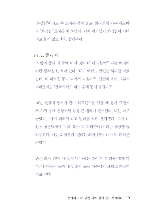 두 딸에게 물어본 적이 있다. “엄마 아빠가 나중에 아프면 어떻게 할 거야?” 두 딸은 조금도 망설임 없이 좋은 요양병원에 모시겠다고 말했다. 아이들의 세대는 우리와 다르다. 그것을 인정해야 한다. 우리 부부는 헬스장에 등록하고 그 비싼 PT를 시작했다. 아이들이 커서 나와 같은 상황에 처했을 때, 정말 나를 요양 병원에 보낼 수도 있을 것이다. 건강을 위해 꾸준히 운동하고 그래도 아프면 요양병원에 가서 예수님을 전할 것이다. 딸들이 나를 요양병원에 보내더라도 슬프지 않을 것이다. 내 곁에는 항상 예수님이 계시기 때문이다.