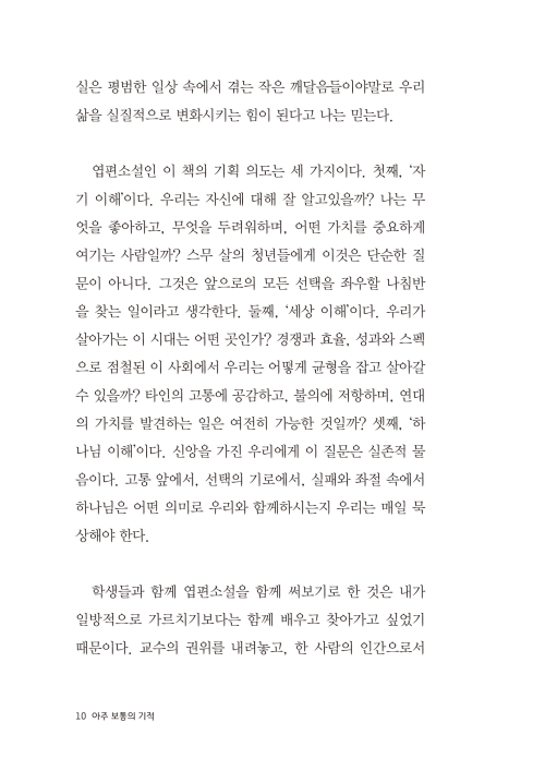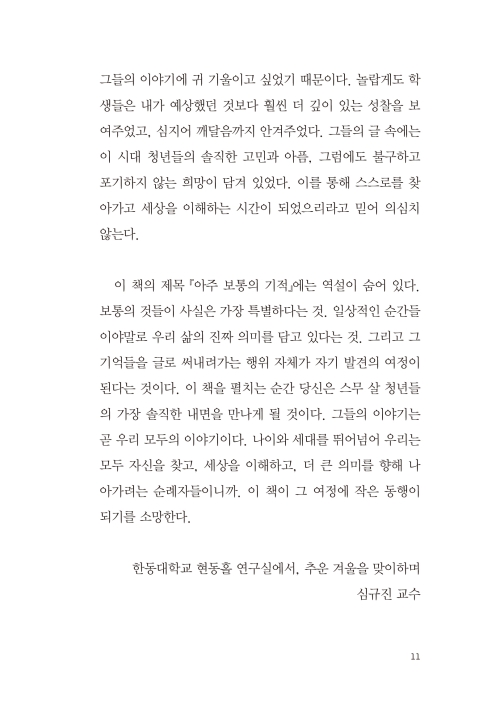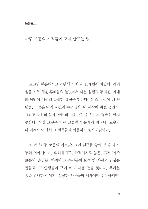 오늘 우리는 끝없이 흘러넘치는 콘텐츠 속에 살아갑니다. 스스로의 내면을 들여다보기보다, 외부에서 쏟아지는 자극과 비교 속에서 자아를 규정해 버리기 쉬운 시대입니다. 그런 시대에 『아주 보통의 기적』은 잠시 멈춰 서서 “나는 누구인 가?”라는 오래된 질문으로 돌아가게 만드는 책입니다. 『아주 보통의 기적』은 청년들에게는 앞으로의 삶을 비추는 등불이 되고, 이미 스무 살을 지나온 이들에게는 자신을 돌아보는 귀한 거울이 될 것입니다. 이 책이 당신의 시간 속에서, 아주 사소한 보통의 순간 하나가 기적처럼 빛나는 경험으로 이어지기를 바라며, 기꺼이이 아름다운 여정을 추천합니다.
