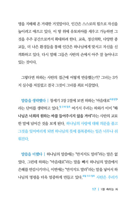인용한 성경의 각 구절들도 이 책의 백미다. 구약의 네 인물인 하와, 욥, 다윗, 대제사장 여호수아의 예를 통해 사탄의