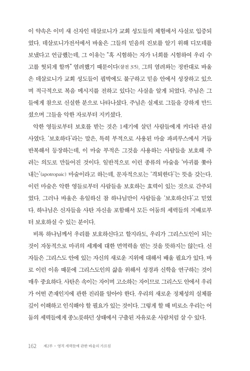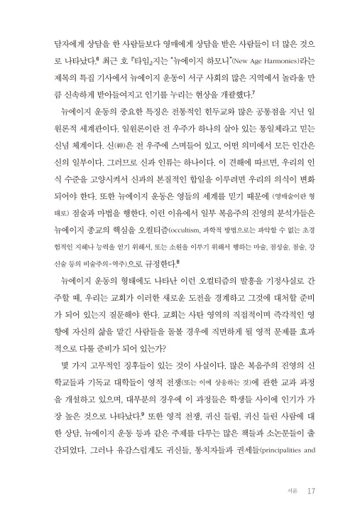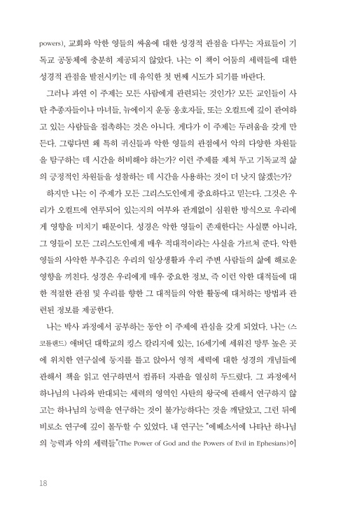 하지만 나는 이 주제가 모든 그리스도인에게 중요하다고 믿는다. 그것은 우리가 오컬트에 연루되어 있는지의 여부와 관계없이 심원한 방식으로 우리에게 영향을 미치기 때문이다. 성경은 악한 영이 존재한다는 사실뿐 아니라, 그 영이 모든 그리스도인에게 매우 적대적이라는 사실을 가르쳐준다. 악한 영의 사악한 부추김은 우리의 일상생활과 우리 주변의 사람들의 삶에 해로운 영향을 끼친다. 성경은 우리에게 매우 중요한 정보, 즉 이런 악한 대적에 대한 적절한 관점 및 우리를 향한 그 대적들의 악한 활동에 대처하는 방법과 관련된 정보를 제공한다. _ 18쪽