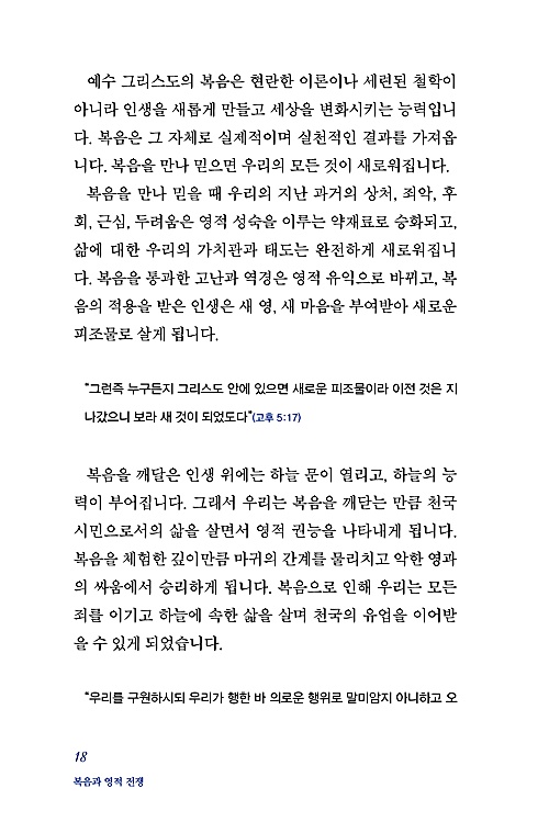 복음은 바로 지금 여기에서 우리의 영혼을 살리고 인생을 변화시키며 천국을 경험하게 하는 생생한 힘입니다. 그리스도인은 아무것도 가지고 있지 않아도 오직 복음의 능력으로 어두운 세상 속에서 빛을 발하며 하나님의 뜻을 이룰 수 있습니다. 그런데 오늘날 너무도 많은 성도들이 살아있는 복음의 능력을 체험하지 못하고 죄와 상처의 올무에 매여 병든 마음, 병든 영혼, 병든 육체로 살아가고 있습니다.