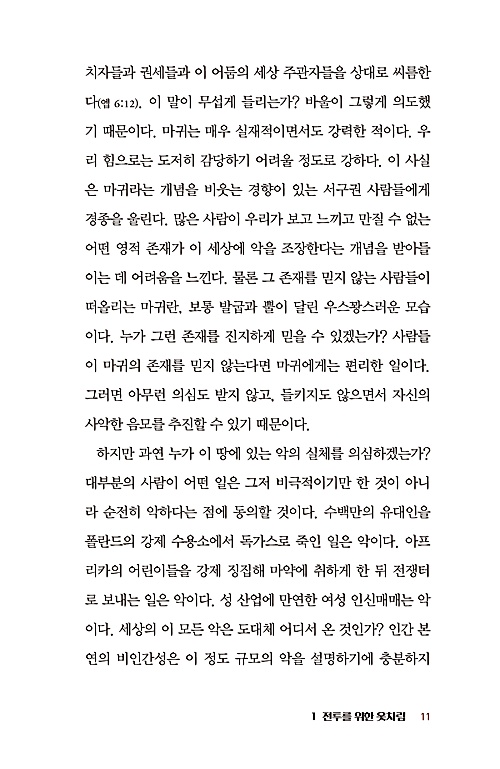 기독교는 진리를 강력히 주장한다. 그리고 우리가 마귀에 맞서기 위해 허리띠로 삼아야 하는 진리는, 무엇보다도 우리가 믿는 것의 진리다. 즉 하나님이 누구신지, 우리가 누구인지, 하나님이 피조물인 우리에게 요구하시는 것이 무엇인지에 대한 복음의 메시지다. 이 진리는 하나님의 말씀인 성경을 통해 우리에게 계시된다. _p34 진리의 허리띠