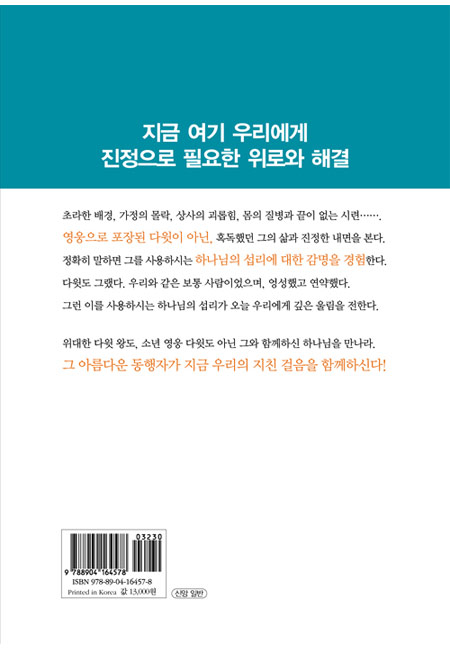 이 책은 우리에게 너무나 유명한 다윗 왕의 위대한 업적이나 소년 영웅의 모험담을 이야기하고자 하는 것이 아니다. 우리와 다를 바 없었던, 그저 평범하고 연약한 보통 사람 다윗을 만날 수 있다. 그는 변변한 배경이나 환경을 갖지 못했으며, 사랑받지 못하는 어린 시절을 보냈고, 지독한 상사를 만나 고생했으며, 추악한 죄를 지었다. 또 자식들의 문제를 겪었으며 육체의 질병에 괴로워하기도 했다. 다윗의 전 생애를 따라 쓰인 이 책은 당시 다윗이 처해진 상황과 그의 심리를 세밀하게 살펴볼 수 있다. 그렇게 이 책에서 이야기하는 다윗의 삶을 따라가다 보면, 어느 순간 다윗은 보이지 않는다. 보통 사람 다윗은 없어지고, 그를 들어 쓰신 위대한 하나님을 만나게 될 것이다. 다윗이 위대한 것이 아니라 다윗이 붙잡았던 그 하나님이 위대하셨음을, 그래서 그의 인생이 위대하게 쓰임 받았음을 깨달을 수 있을 것이다. 그의 삶은 지치고 아픈 우리를 공감과 소망으로 위로하며, 궁극적으로 그와 함께하셨던 아름다운 동행자 하나님을 다시 바라보게 한다.
