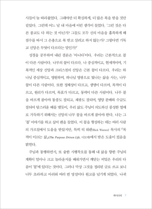 오랫동안 나는 언젠가 이 땅의 크리스천들을 위해 써야 할 가장 긴급하고 중요한 책이 있다면 그것은 신앙생활을 위해 더 많은 정보가 담긴 크리스천 백과사전이 아닌, 크리스천 됨의 큰 그림을 보여주는 지도책이라고 생각해왔다. 성인이 되어서 교회를 다니기 시작한 나 역시 다른 사람들처럼 신앙생활의 갈등과 시행착오를 많이 겪었다. 그 이유는 크리스천이란 어떤 사람인지, 무엇이 다른 것인지에 대한 큰 그림 없이 시작했기 때문이다. 큰 그림을 보지 못해 얼마나 많은 마음고생을 하며 오늘에 이르렀는지 모른다.