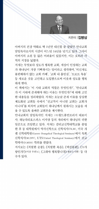 저자는 탁월한 예배 지도자, 흡입력 있는 설교가, 새로운 목회 패러다임을 창조하는 리더다. 그는 성경을 묵상하고 책을 가까이하여 얻은 지혜를 후히 나누며, 많은 그리스도인에게 올바른 신앙의 길을 안내하는 목회자다. 저자는 “교회가 이 땅의 소망입니다”라는 슬로건 아래, 교회가 담장을 넘어 세상 속에서 소망이 되기를 꿈꾼다. 무엇보다 성도가 행복한 교회, 세상이 인정하는 교회가 세워지는 것이 하나님이 가장 기뻐하시는 일이라고 생각하기에 ‘비신자도 불편해하지 않는 교회 카페’, ‘교회 내 흡연실’, ‘트로트 특송’ 등 새로운 것을 도입함으로써 이웃과 성도의 마음을 복음을 향해 열어 가고 있다.