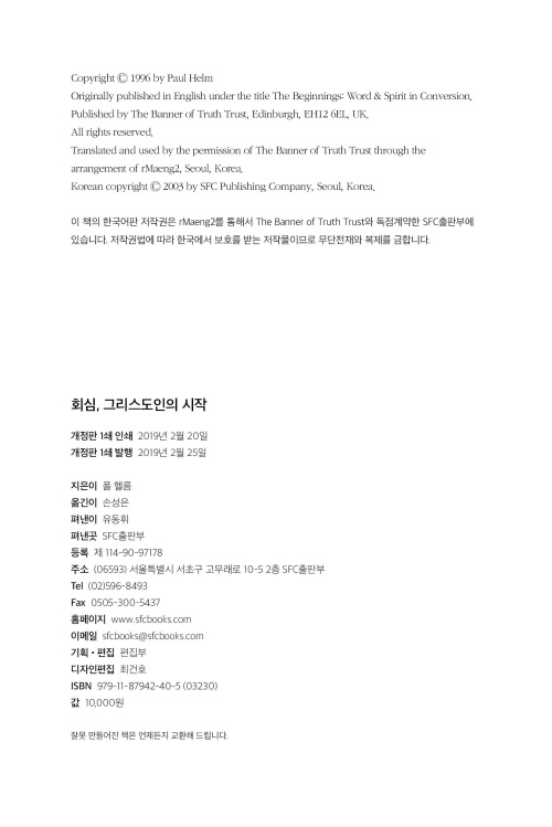 저자는 회심의 필수적인 요소들인 죄의 자각, 구원하는 신앙, 그리고 참된 회개에 관해서 자세하게 다루는 한편, 오늘날 많은 논쟁을 일으키는 율법주의, 신앙과 확신의 관계, 정확한 언어의 사용 등에 대해서도 통찰력 깊게 다루고 있다.