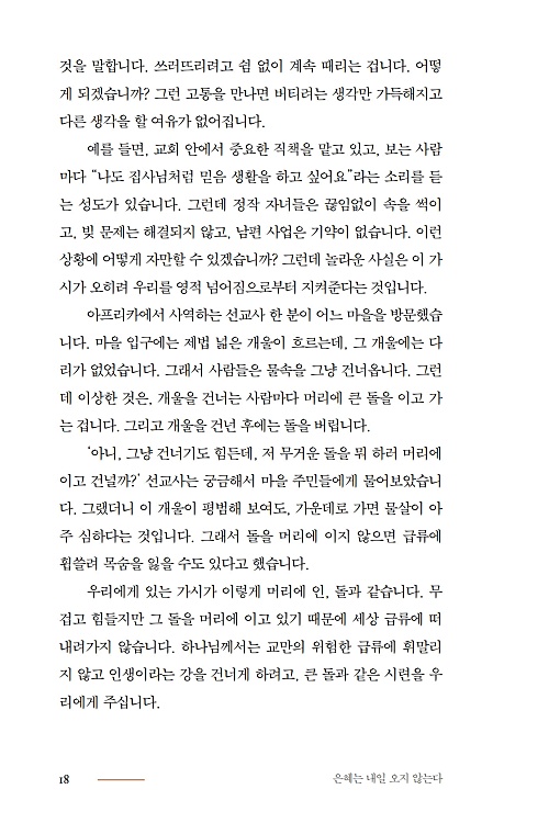 지금 당장 한 줄기 희망조차 보이지 않더라도, 아직도 절망의 기운이 내 삶을 온통 지배하는 것처럼 보여도 여전히 하나님의 은혜가 이 모든 것을 압도하고 있음을 설득력 있게 전한다.