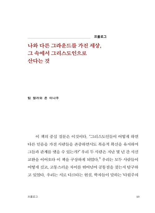 이 책의 중심 질문은 이것이다. “그리스도인들이 어떻게 하면 다른 믿음을 가진 사람들을 존중하면서도 복음적 확신을 유지하며 그들과 관계를 맺을 수 있는가?” 우리 두 사람은 지난 몇 년 간 서신 교환을 이어오다 이 책을 구상하게 되었다. 우리는 모두 사람들이 어떻게 깊고, 고통스러운 차이를 뛰어넘어 공통점을 찾는지 탐구하고 있었다. 우리는 서로 다르다는 현실, 학자들이 말하는 ‘다원주의의 엄연한 현실’에 기독교적으로 대응하는 법을 배우고 싶었다. 다원주의라는 현실은 적어도 미국에서는 ‘나뉠 수 없는 한 나라’와 ‘보다 완벽한 연합’ 추구라는 이상에 가려지는 경우가 많다. 그러나 일반적으로 우리의 실존을 규정하는 것은 일치보다는 차이와 불일치다. 미국인들은 오늘날 대다수 서구 국가 시민들과 마찬가지로, 자기 나라의 목적, 공동선의 본질, 인간 번영의 의미에 관해 좀처럼 합의점을 찾지 못한다. 이런 견해 차이는 우리가 생각하는 내용뿐 아니라 생각하고 세계를 보는 방식에도 영향을 미친다. 가장 중요한 문제들에 대한 깊고 절대 좁혀지지 않을 차이, 이것이 오늘날 다원주의의 현실이다.
