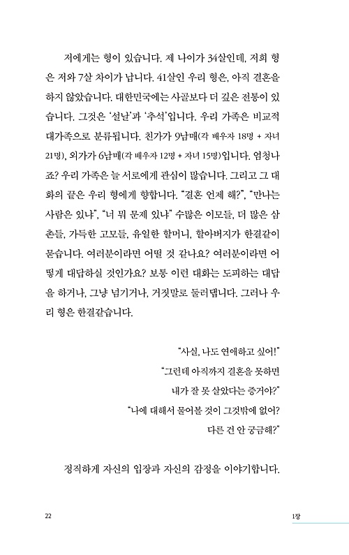 하나님은 인간이 홀로 서는 법을 배우길 원하신다는 것입니다. 만약 그대가 적절할 나이지만(?) 여전히 혼자라면, 그것은 잘못된 것이 아닙니다. 또한 잘 못하는 것도 아닙니다. 혼자라는 무게감으로 그 어떤 불안함을 가질 필요가 없습니다. p.16