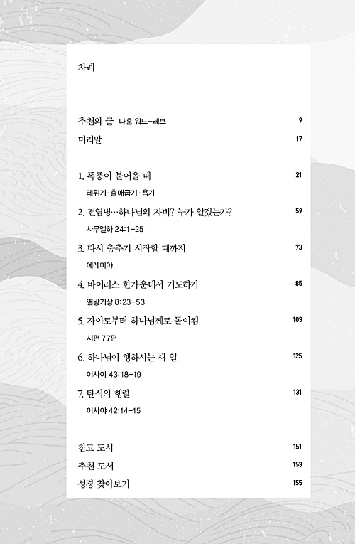 브루그만의 글들은 늘 예언적이다. 하지만 하나님의 언약이라는 그분의 인자한 숨결을 느낄 수 있는 그 비밀을 드러내는 데 결코 인색하지 않다. 이 책은 당대의 칼, 기근, 전염병이라는 고난 가운데 부르짖는 구약 인물들의 탄식을 오늘의 위기 상황에서 다시 읽고 새롭게 음미하게 만든다. 그 속에 함께 아파하는 하나님의 눈물과 슬픔이 있음을 우리에게 보여 준다. 나와 우리의 상실 속에 하나님의 상실이 있고, 우리의 비통과 신음 속에 하나님의 비통과 신음이 있음을 알린다. 그래서 지금 우리가 맞는 재난 속에서도 언약을 지키시는 선하신 하나님이 함께하시면, 용기와 소망을 품고 다시 일어설 수 있음을 가슴으로 깨닫게 한다. 하나님은 그분의 약속을 단념하거나 그분의 백성을 포기하지 않으시기 때문이다. 읽으면 읽을수록 더 곱씹고 내 것으로 삼고 싶은 책이다. 위기 속에서 뉴 노멀을 맞는 이 시기에 우리를 다시 겸손히 기도하게 하며 하나님의 말씀인 성경 앞에서 귀 기울이게 한다. _김지철 미래목회와말씀연구원 이사장, 전 소망교회 담임 목사, 전 장신대학교 신약학 교수