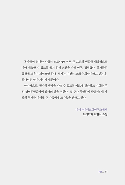 지금 당장 발생 가능한 일은 물론, 힘의 변화를 따라 전혀 예상치 못했던 새로운 도전의 출몰 가능성을 예측했다. 이는 신학적 성찰보다 현실(real world) 속 한국 교회에 관한 주제다. 현실은 다양성과 새로운 가능성이 먼저 움직이는 구조다. 따라서 미리 예측하고 신학적, 성경적 관점에서 논의한다면 많은 도움을 얻을 수 있을 것이다.