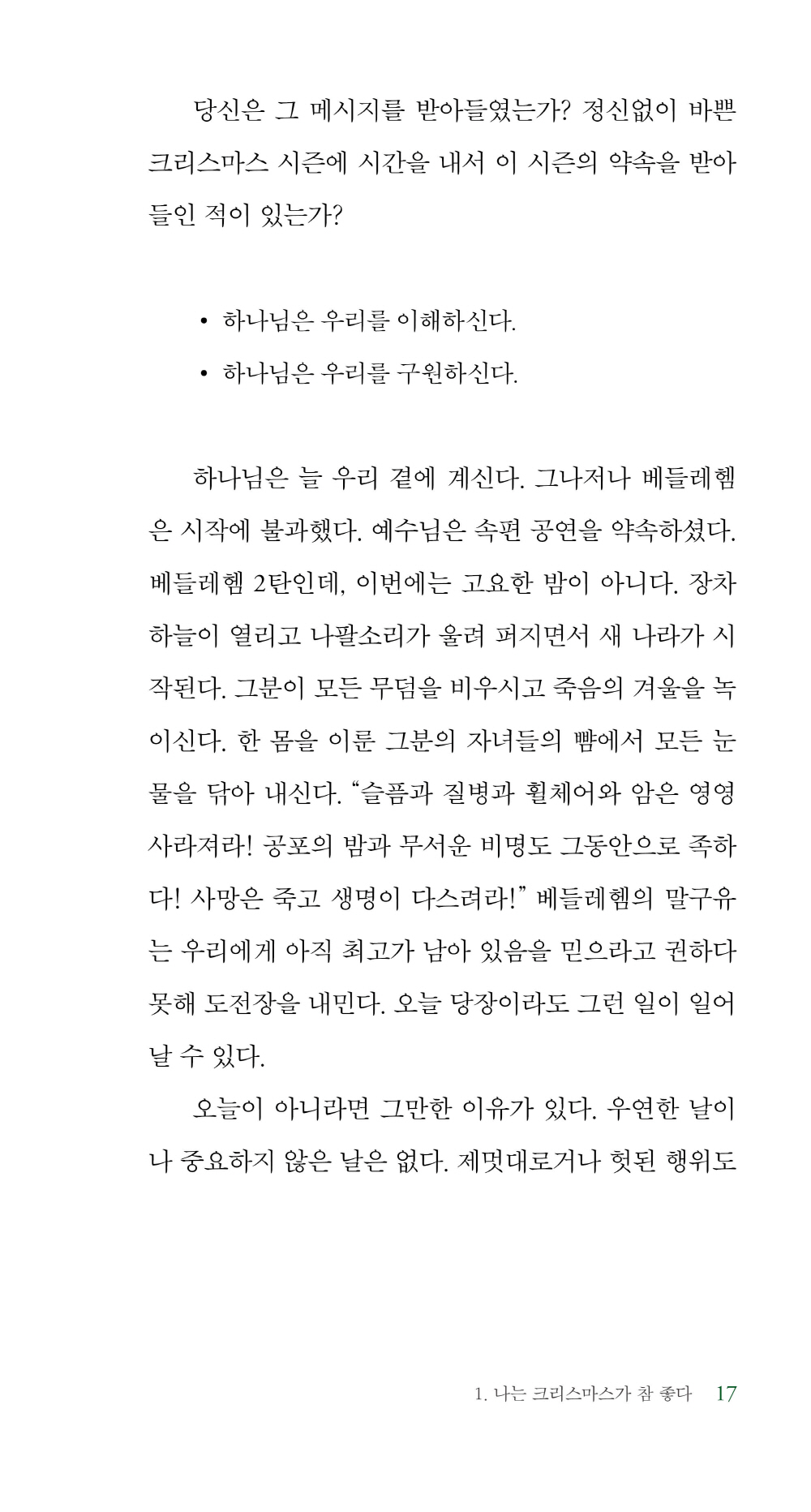 도대체 크리스마스는 무슨 날일까? 무엇이 그리 대단해서 우리의 마음을 들뜨게 하고, 안 하던 선물을 하고 카드까지 쓰게 하는 걸까? 아기 예수의 탄생이 나와 무슨 상관일까?