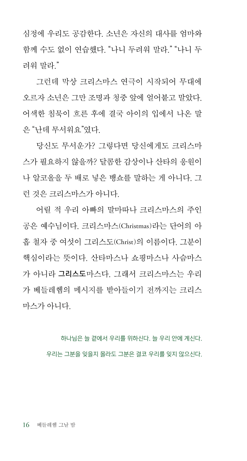 “비범한 선물이 평범한 꾸러미에 담겨 배달될 수 있다. 베들레헴에 그런 선물이 있었다.” - 120쪽