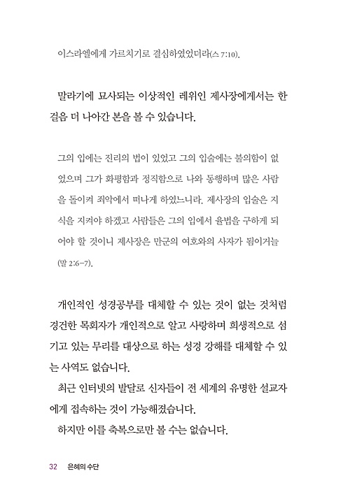 신실하시고 변함없으신 하나님께서 우리가 살고 있는 오늘, 이런 은혜의 수단들을 사용하셔서 우리를 자라게 하시고 조국 교회를 새롭게 변화시키셔서 성령의 놀라운 은혜와 부흥의 역사가 온 조국 교회에 풍성히 흘러 넘쳐나기를 기대하며, 작으나 큰 유익을 주는 이 귀한 책을 기쁜 마음으로 적극 추천하는 바입니다.