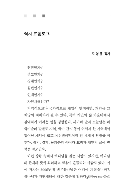 본서가 코로나 팬데믹 시대에 영적 혼란에 빠진 한국교회의 길잡이가 될 것으로 믿는다. 어윈 W. 루처는 본서에서 그리스도인이 대재앙과 자연재해와 전염병에 대해 가지는 질문에 답한다. 죽음을 앞두고서도 죽음을 보지 못하는 인간들을 깨우는 경종이다.