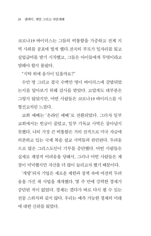 “지금, 이 모든 순간 하나님은 어디에 계십니까?” 그리스도인들은 이 현상을 하나님 중심의 관점에서 이해하려고 시도하고 있다. 많은 사람은 팬데믹, 재앙, 자연재해 등을 하나님이 조율하시는 것이 아니라 타락한 세상의 결과일 뿐이라고 경고했다. 결과적으로 질병은 저주의 일부다. 물론 하나님은 그것을 막으실 수 있지만, 그것은 그분의 의지와 목적과는 별개로 일어나고 있다. 일부 거짓 예언자들은 권위를 가지고 우리의 고통이 짧을 것이라고 보장했다. 지금은 우리가 두렵고 상처받은 세상에서 믿는 자로서 우리의 역할에 대해 더 깊이 생각해야 할 때다. 선하시고 온 세상의 주이신 하나님을 믿는 우리는, 하나님의 영광을 위해 창조된 인간의 고통과 하나님의 관계에 대해 제기되는 질문에 답해야 한다.